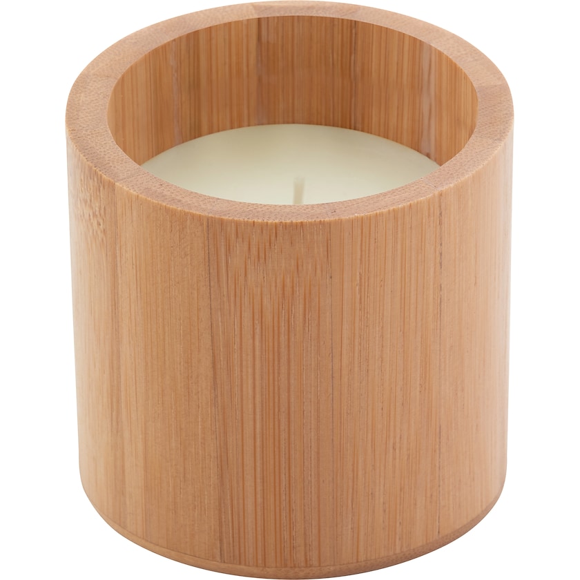 Candela profumata di cera in un contenitore di bambù. La candela diffonde un piacevole profumo di vaniglia. Consegnato in una confezione di carta color naturale.