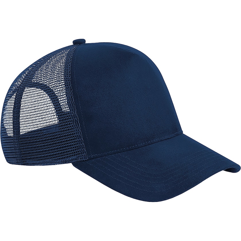 Capellino con frontale e schermo in pelle scamosciata. Il materiale rende il cappello un look unico e molto attraente. La personalizzazione è fatta con il ricamo.