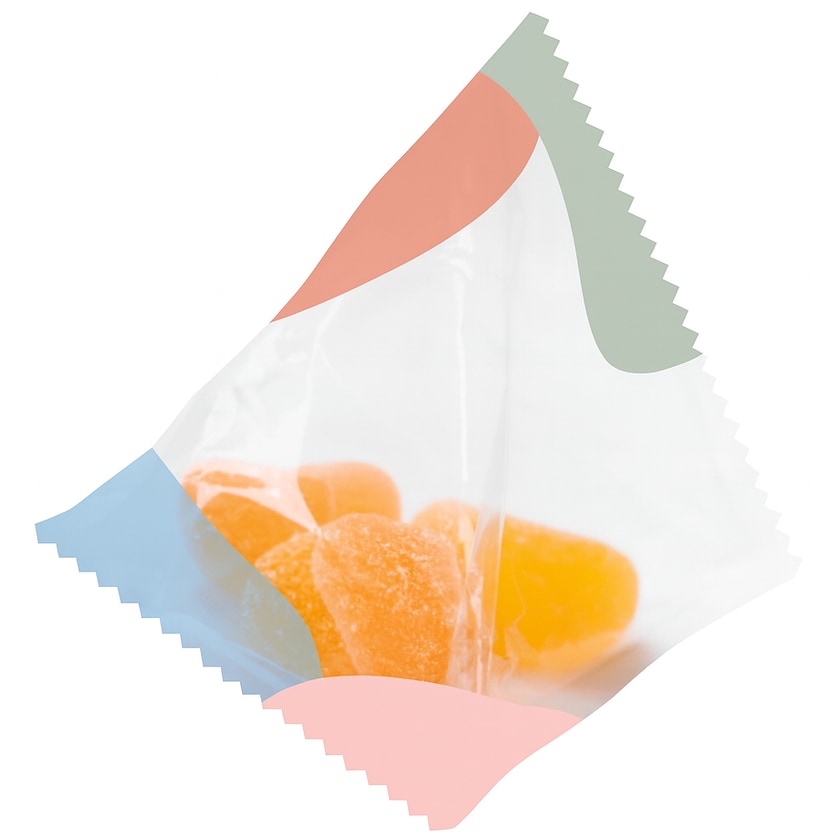 Piramide con caramelle gommose. La piramide contiene un simpatico mix ai gusti di arancia e limone. L'intera confezione può essere stampata secondo i tuoi desideri. Puoi scegliere tu stesso se far realizzare la piramide in materiale opaco o trasparente.
