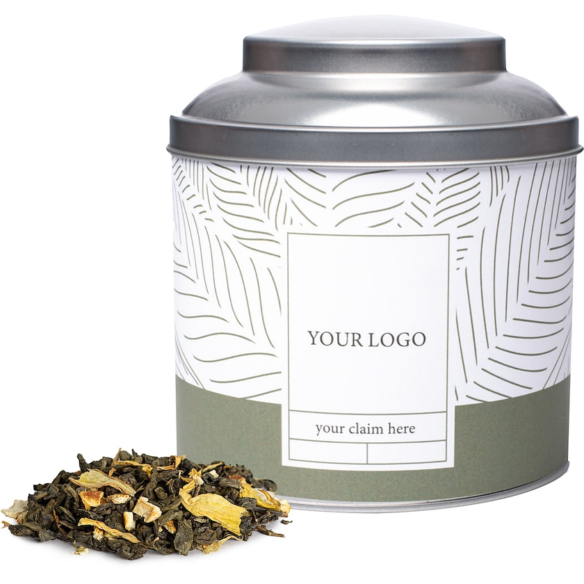 100 grammi di tè in barattolo di latta. L'etichetta personalizzata secondo i tuoi desideri viene posizionata intorno al barattolo. Scegli tra deliziose varietà di tè. Sunny Garden è un tè verde con scorze di limone, scorze di arancia, ananas, foglie di girasole e di calendula. Orange Dream è un tè Earl Gray con scorze di arancia.