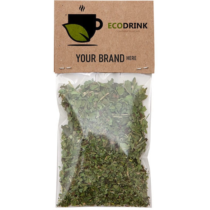 Bustina di tè ecologico. Le bustine di tè sono dotate di un'etichetta non sbiancata che viene personalizzata secondo i tuoi desideri. Scegli tra due tipi di tè diversi. La quantità è sufficiente per tre infusioni.
