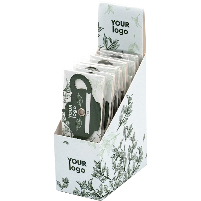 Scatola di carta con 10 buste di tè di tipo Shelford. La stampa viene realizzata sulla scatola di carta e sull'etichetta di ogni busta di tè. Scegli tra quattro gusti interessanti. Perfetto per la cucina.