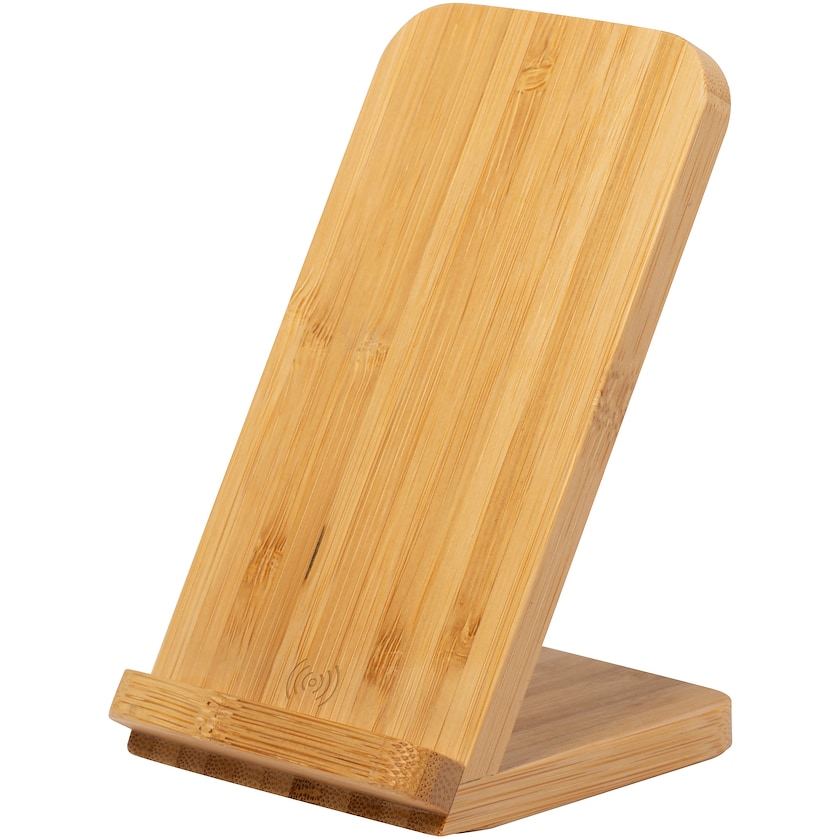 Caricabatterie senza fili che funge anche da supporto per cellulare. Questo caricabatterie è realizzato in vero bambù e decora qualsiasi ambiente. Output massimo 1000 mA. Cavo di alimentazione USB incluso. Il logo può essere stampato a un colore oppure inciso a laser.