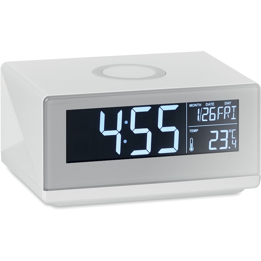 Caricabatterie senza fili che funge anche da stazione meteo e sveglia. Il caricabatterie è compatibile con tutti i cellulari di ultima generazione.