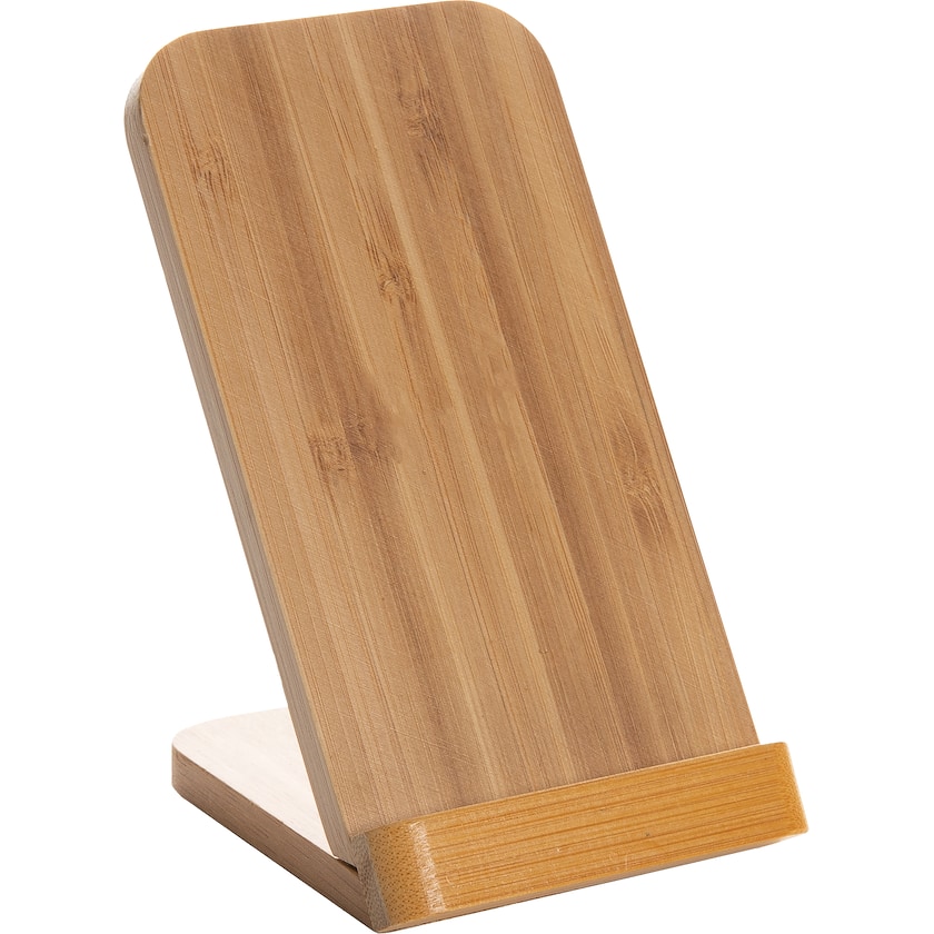 Caricabatterie senza fili in bambù certificato FSC. Funge anche da pratico supporto per cellulare. Viene consegnato con un cavo micro-USB in TPE riciclato.