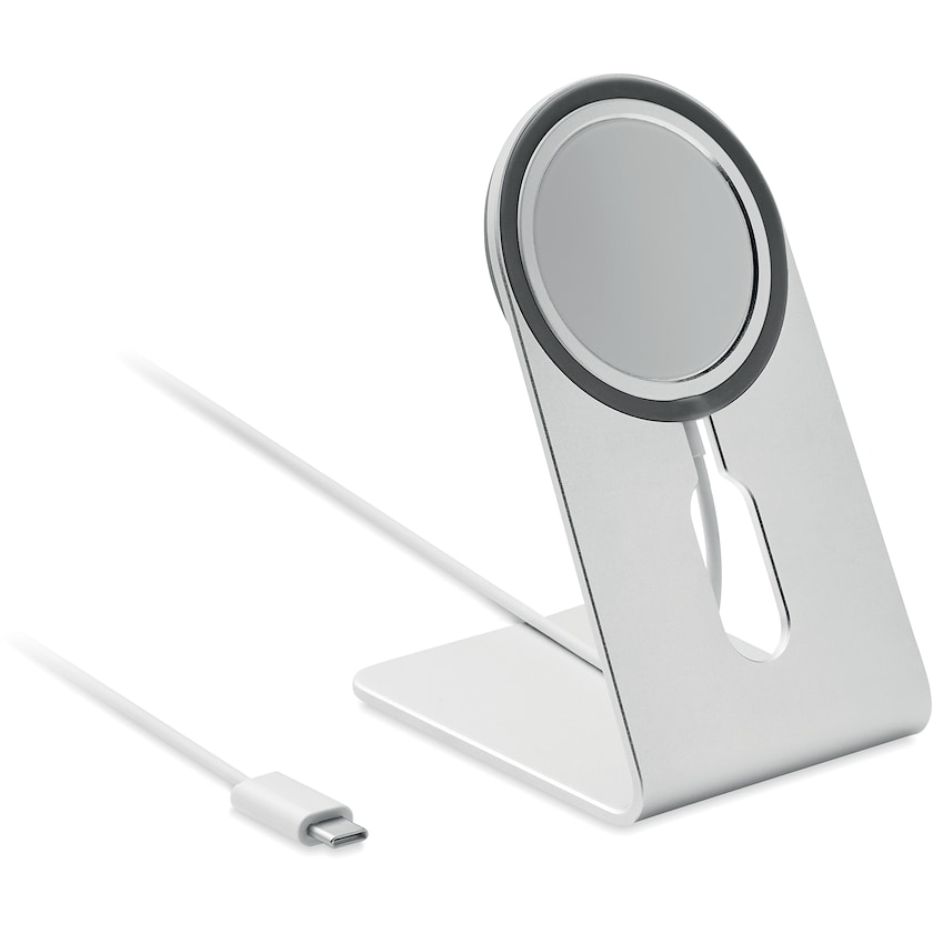 Caricabatterie magnetico senza fili in alluminio. Compatibile con i modelli Android di ultima generazione, con iPhone 12 e più recenti. È incluso anche un anello magnetico extra per permettere la ricarica anche di telefoni non magnetici. Il logo può essere stampato oppure inciso a laser.