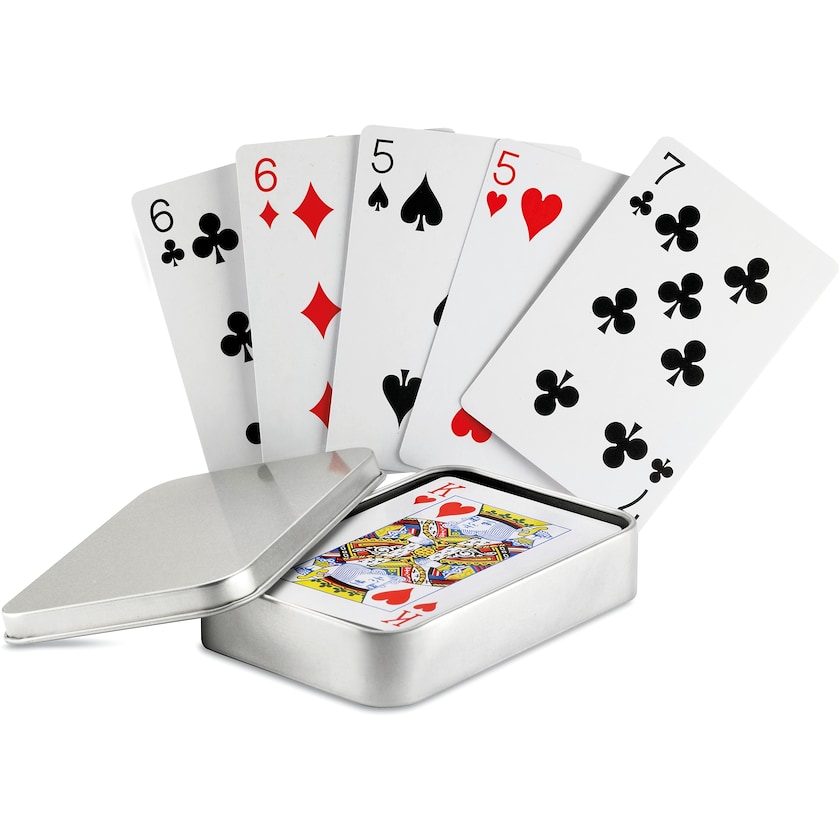 Set con mazzo di carte in scatola di metallo. Il mazzo contiene 54 carte. La stampa viene realizzata solo sulla scatola di metallo.