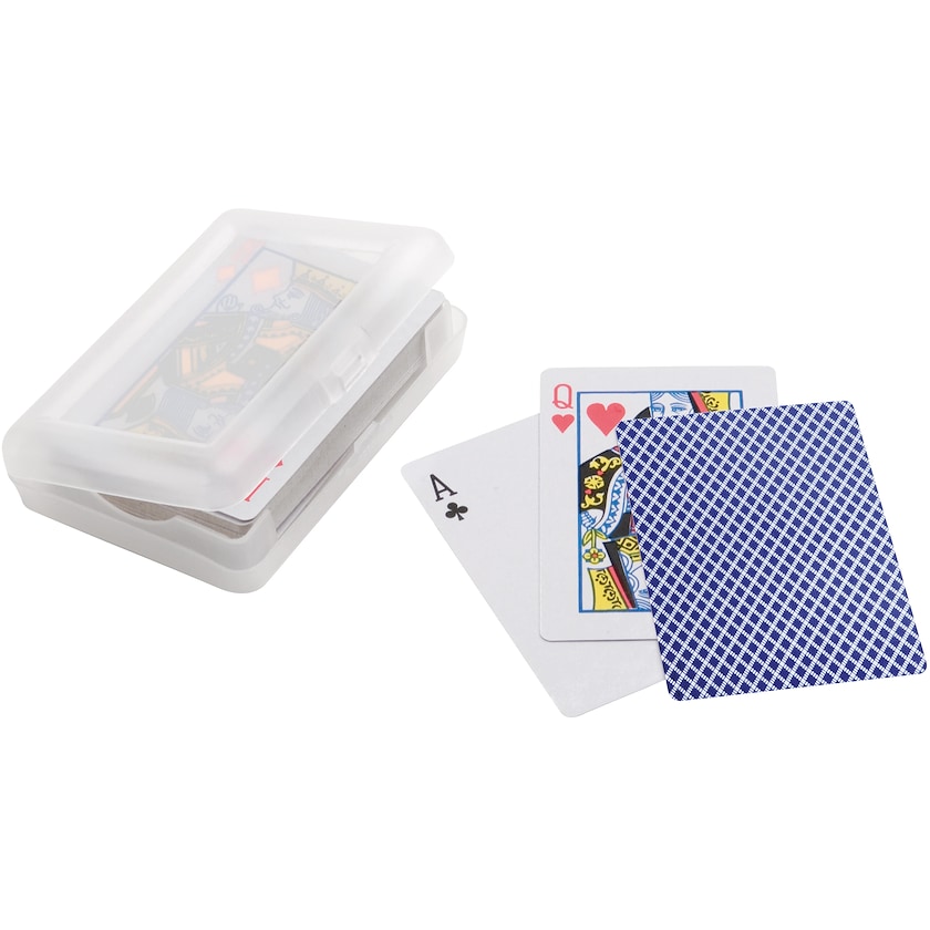 Mazzo di carte con 54 carte da gioco in una scatola di plastica. La stampa viene realizzata sulla parte superiore della scatola di plastica.