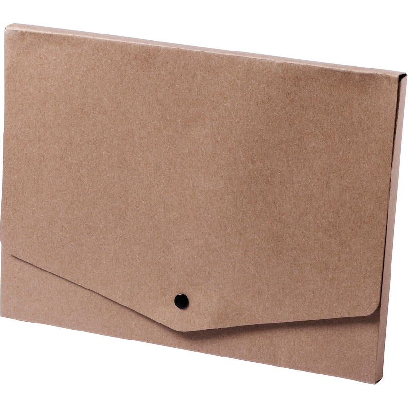 Cartellina di carta riciclata. Isolde ha un ampio spazio per contenere i documenti e il coperchio ha un bottone che tiene chiusa la cartella.
