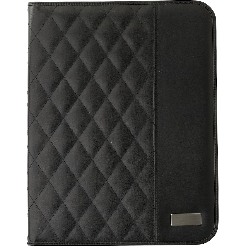 Pregiata cartella portadocumenti con copertina in simil pelle. All'interno si trova un blocco appunti con 25 fogli a righe e diverse tasche e portapenne. La personalizzazione viene realizzata con incisione a laser sulla targhetta in metallo sulla copertina della cartella.