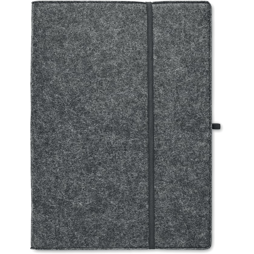 Cartella portadocumenti con copertina in feltro riciclato. All'interno si trova un portapenna, molte tasche e un blocco per gli appunti con 100 fogli a righe.