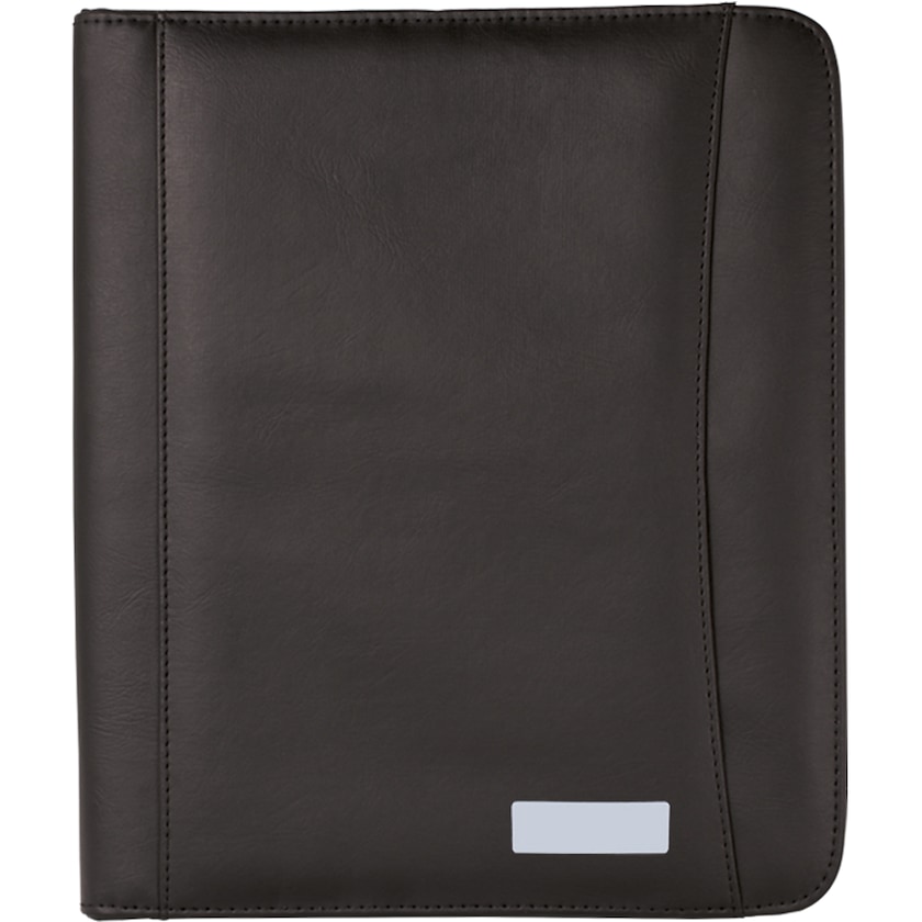Cartella per conferenze in simil pelle in formato A5. All'interno si trova un supporto per iPad (oppure un tablet di altro tipo da 9,7 pollici). È incluso un blocco per appunti con 20 fogli a righe. Il logo viene inciso a laser sulla targhetta di metallo. L'incisione a laser è di colore nero.