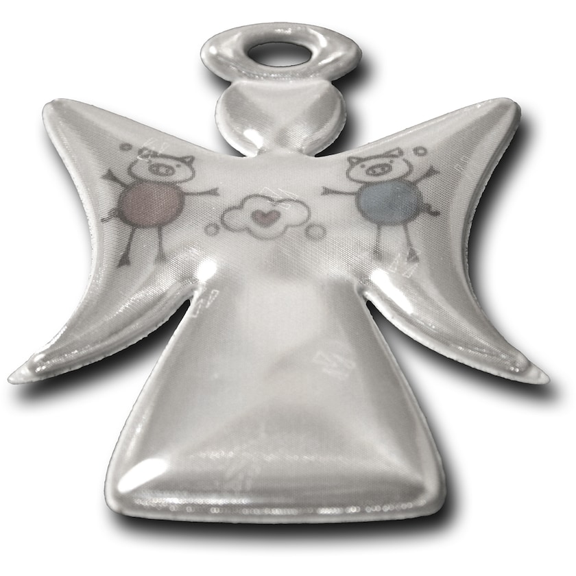 Reflex morbido a forma di angelo. Con laccetto e spilla da balia, o con catenina di metallo. Il materiale catarifrangente è di 3M Scotchlite ed è conforme alla normativa EN13356:2001. La stampa viene effettuata sotto il catarifrangente per non comprometterne l'efficacia.