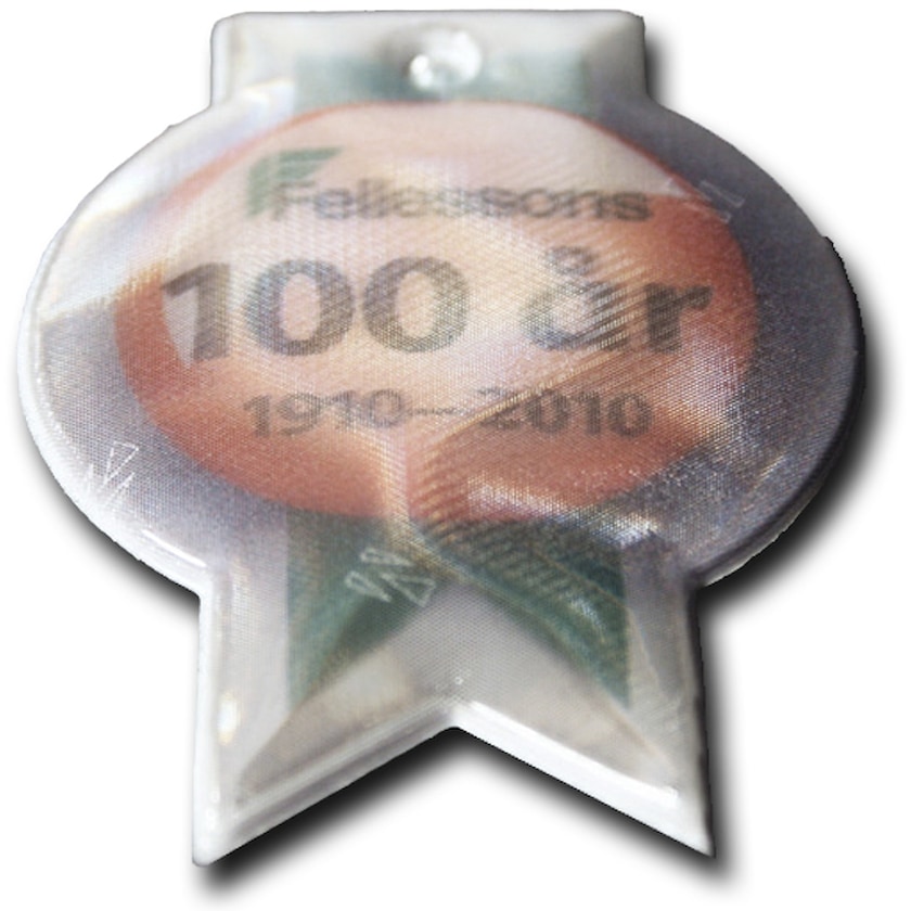 Reflex realizzato con materiale catarifrangent edi prima qualità. Con laccetto e spilla da balia, o con catenina di metallo. Il materiale catarifrangente è di 3M Scotchlite ed è conforme alla normativa EN13356:2001. Personalizzabile con stampa sotto il rivestimento catarifrangente.