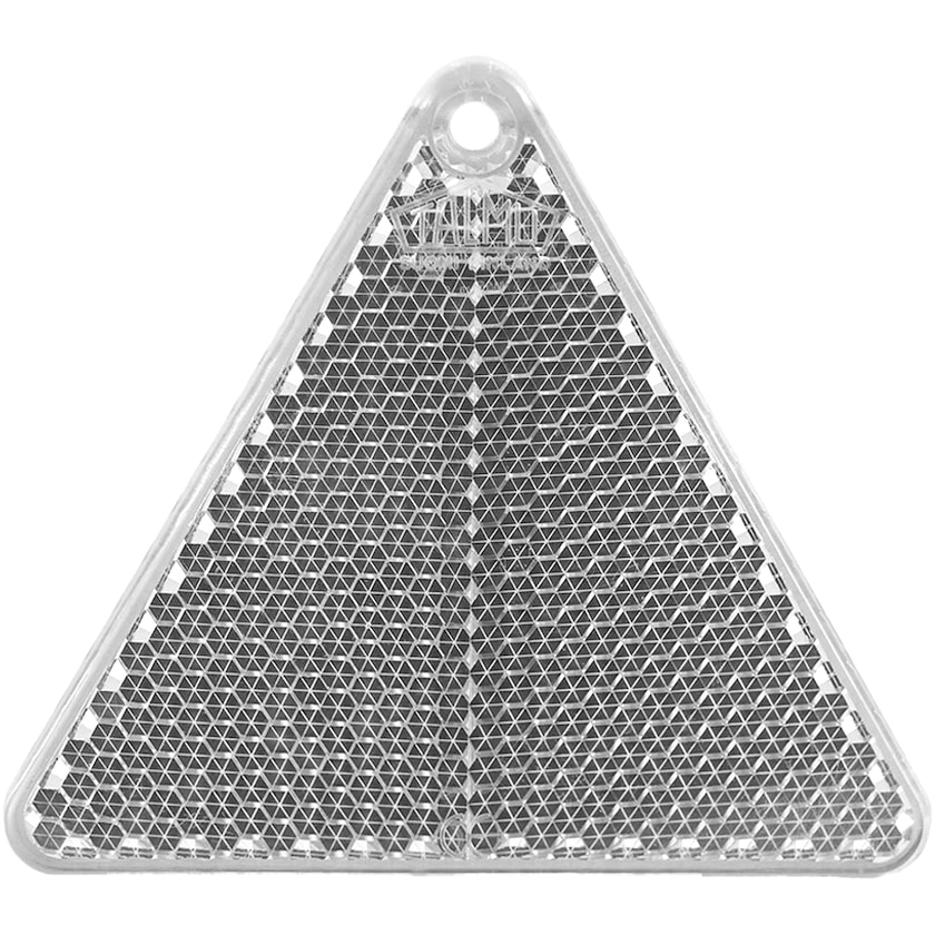 Catarifrangente triangolare in plastica dura. Il catarifrangente è realizzato in Europa ed è certificato secondo CE EN 17353:2020 B1. Consegnato con laccetto e spilla da balia o con catenina di metallo.