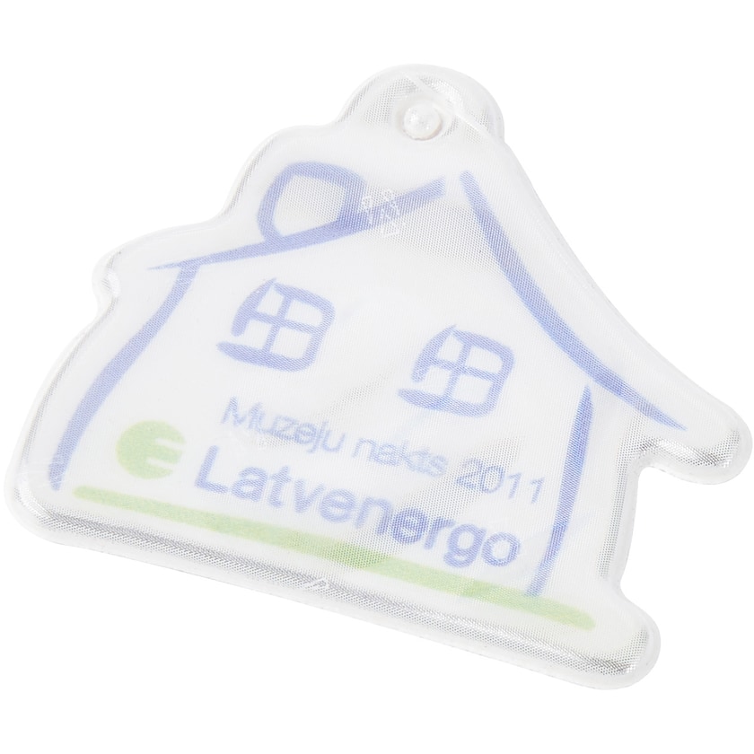 Reflex morbido a forma di baita. Con laccetto e spilla da balia, o con catenina di metallo. Il materiale catarifrangente è di 3M Scotchlite ed è conforme alla normativa EN13356:2001. La stampa viene effettuata sotto il rivestimento reflex per non diminuire l'efficacia del catarifrangente.
