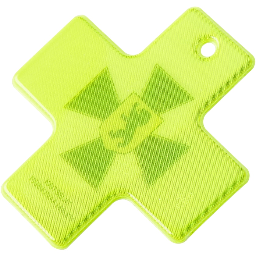 Catarifrangente morbido a forma di croce. Con laccetto e spilla da balia, o con catenina di metallo. Il materiale catarifrangente è di 3M Scotchlite ed è conforme alla normativa EN13356:2001. La stampa viene effettuata sotto il catarifrangente per non comprometterne l'efficacia.