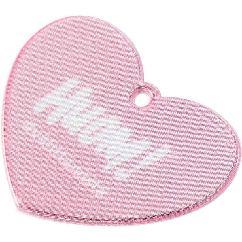 Reflex a forma di cuore, in materiale morbido. Fornito con spilla da balia, laccetto oppure catenina di metallo. Con laccetto e spilla da balia, o con catenina di metallo. Il materiale catarifrangente è di 3M Scotchlite ed è conforme alla normativa EN13356:2001. La stampa viene effettuata sotto il catarifrangente per non comprometterne l'efficacia.