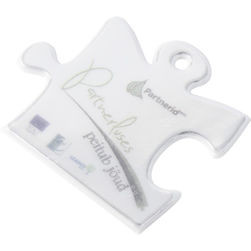 Reflex morbido a forma di pezzo del puzzle. Con laccetto e spilla da balia, o con catenina di metallo. Il materiale catarifrangente è conforme alla normativa EN13356:2001. La stampa viene effettuata sotto il catarifrangente per non comprometterne l'efficacia.