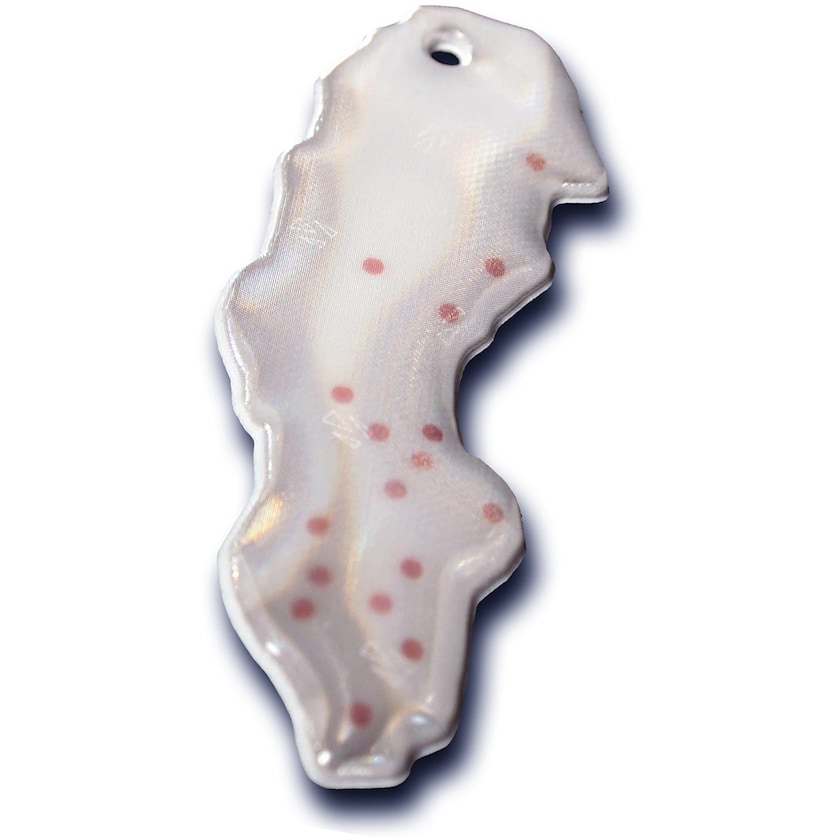 Catarifrangente morbido con la forma geografica della Svezia. Con laccetto e spilla da balia, o con catenina di metallo. Il materiale catarifrangente è di 3M Scotchlite ed è conforme alla normativa EN13356:2001. La stampa viene effettuata sotto il catarifrangente per non comprometterne l'efficacia.