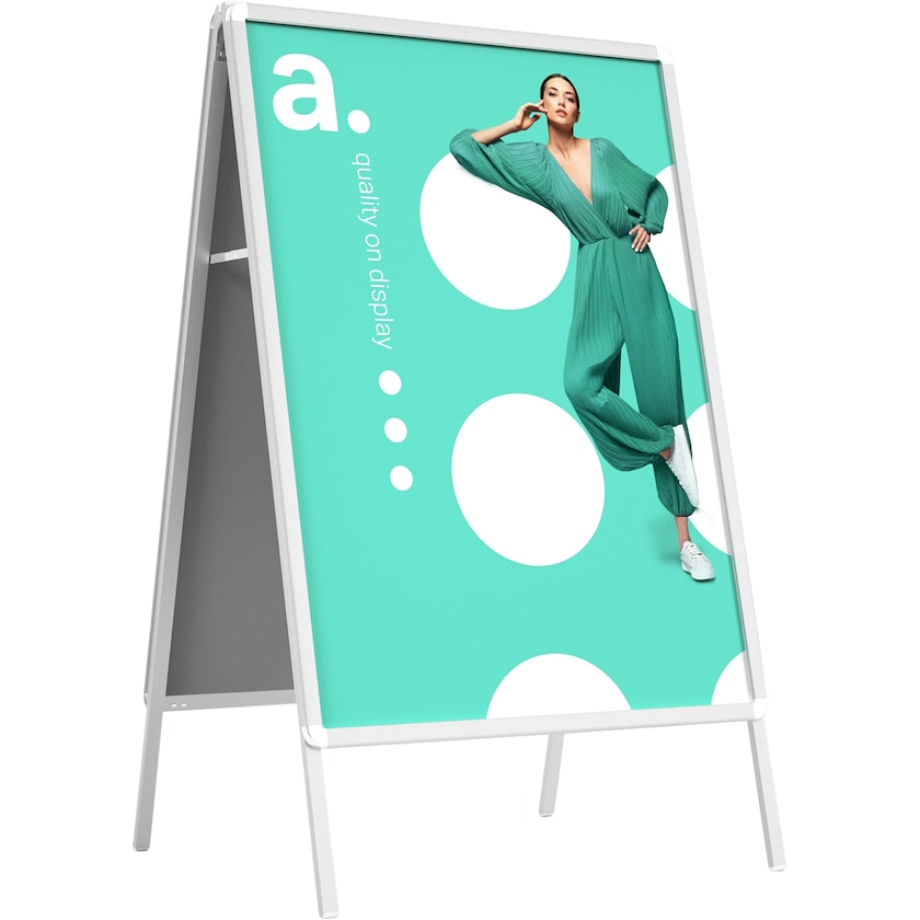 Grande cavalletto pubblicitario in robusto alluminio anodizzato. Next 84 utilizza un'intelligente tecnica Open-In-Open-Zip che permette di cambiare facilmente la fantasia. Questa tecnica rende facile aprire il cavalletto e quindi anche cambiare la fantasia. La stampa viene protetta da una superficie antiriflesso che conferisce una visibilità insuperabile alla fantasia. La fantasia corrisponde alla dimensione A0.