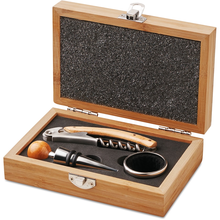 Piccolo set da vinco in acciaio inox e bambù. Il set elegante ideale per chi è appassionato di vini. La stampa e l'incisione a laser sono realizzate sulla scatola.