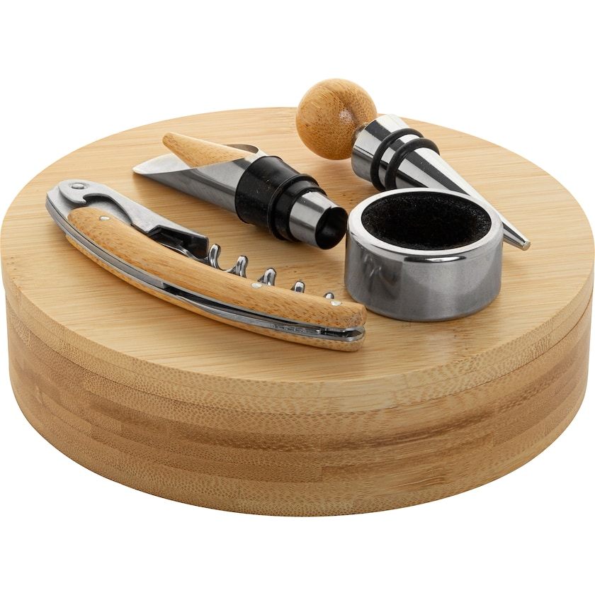 Set da vino con quattro accessori un una scatola di bambù rotonda. I quattro accessori sono realizzati in bambù e acciaio inox. Un regalo fantastico per gli amanti del vino.