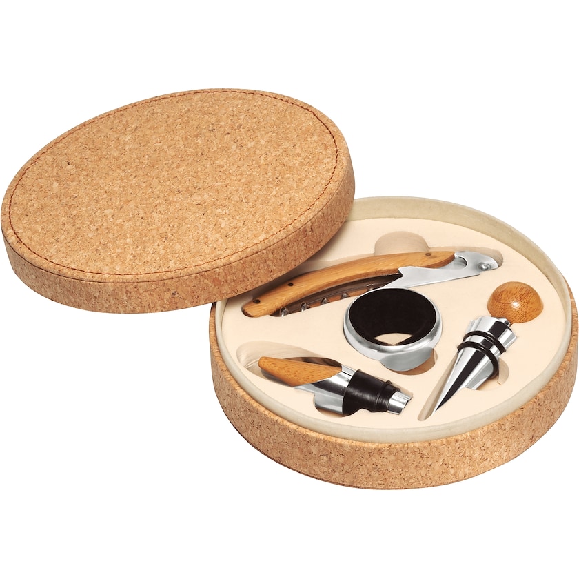 Set da vino in bella scatola di sughero. Ecco tutto il necessario per i veri conoscitori di vini. Il logo può essere stampato oppure inciso a laser sulla scatola.