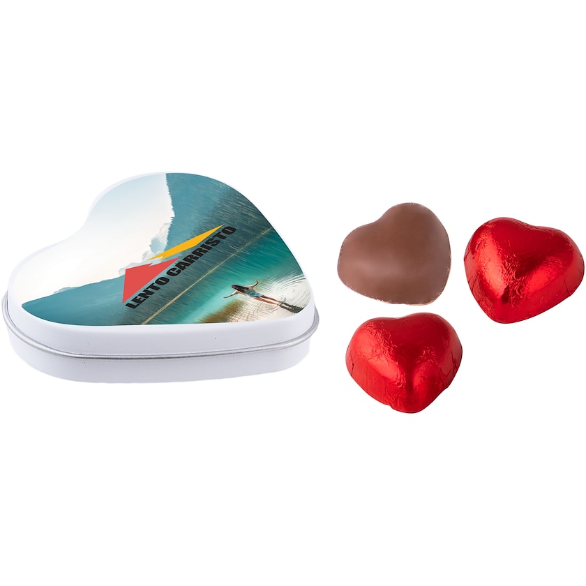 Tre cioccolatini a forma di cuore avvolti in incarto rosso all'interno di una scatola di metallo a forma di cuore. Il tappo della scatola di metallo viene interamente stampato secondo i tuoi desideri. Ecco un regalo delizioso e sentito!