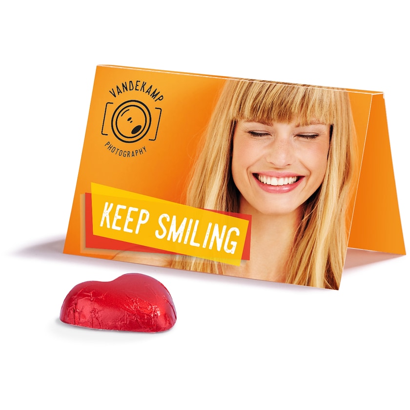 Fai pubblicità col cuore! Cartolina con cioccolatino a forma di cuore avvolto in incarto rosso. Entrambi i lati della cartolina vengono interamente personalizzati secondo i tuoi desideri. La cartolina è perforata: un lato può quindi essere usato come biglietto da visita o come coupon.