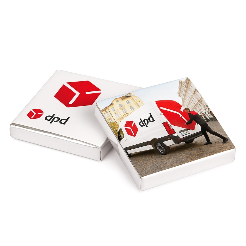 Cioccolatini in cioccolato ecologico certificato Fairtrade. Scegli tra cioccolato al latte e fondente. Puoi scegliere anche se avere incarto argentato o dorato.