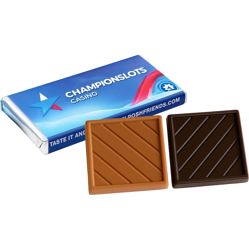 Due cioccolatini quadrati in confezione. I cioccolatini sono disponibili ai gusti cioccolato al latte 32% e cioccolato fondente 70%. Scegli uno dei due gusti per entrambi i cioccolatini o un gusto diverso per ciascun cioccolatino. Puoi anche scegliere tu stesso se preferisci una confezione argentata o dorata.