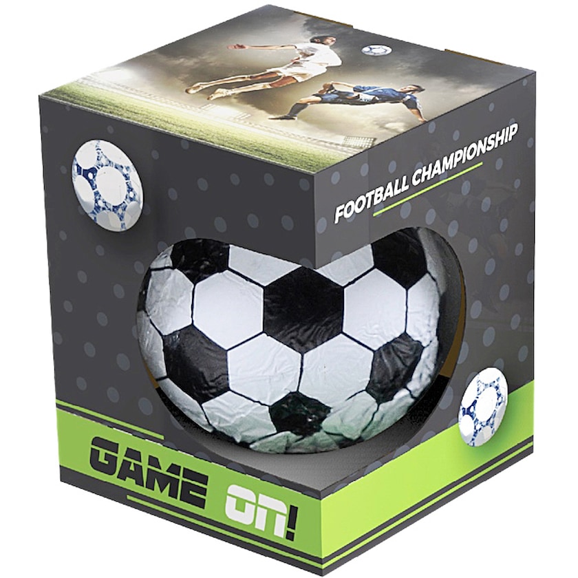Pallone di cioccolato in confezione con stampa personalizzata. L'intera confezione è personalizzabile secondo i vostri desideri. Un must per tutti gli appassionati di calcio. Contattaci per informazioni sui gusti di cioccolato disponibili.