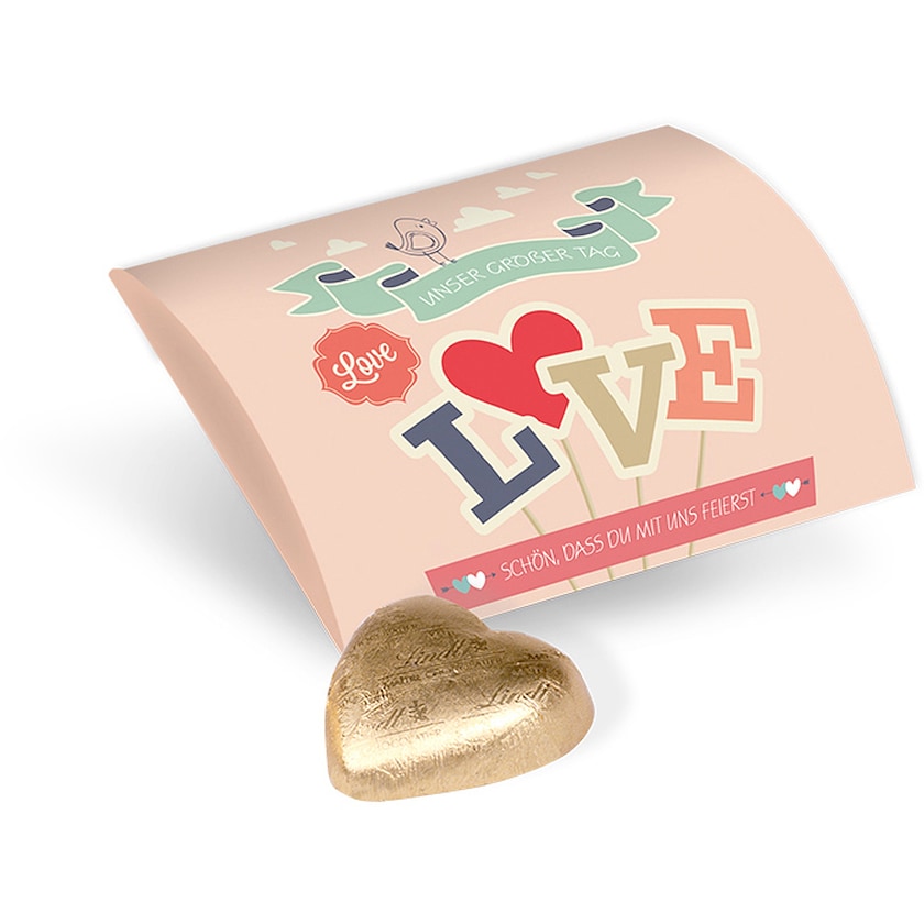Cuoricino di cioccolato Lindt in confezione di carta personalizzata. Sia l'esterno che l'interno della confezione vengono personalizzate secondo i vostri desideri. Scegli tra foglio di alluminio dorato o rosso.