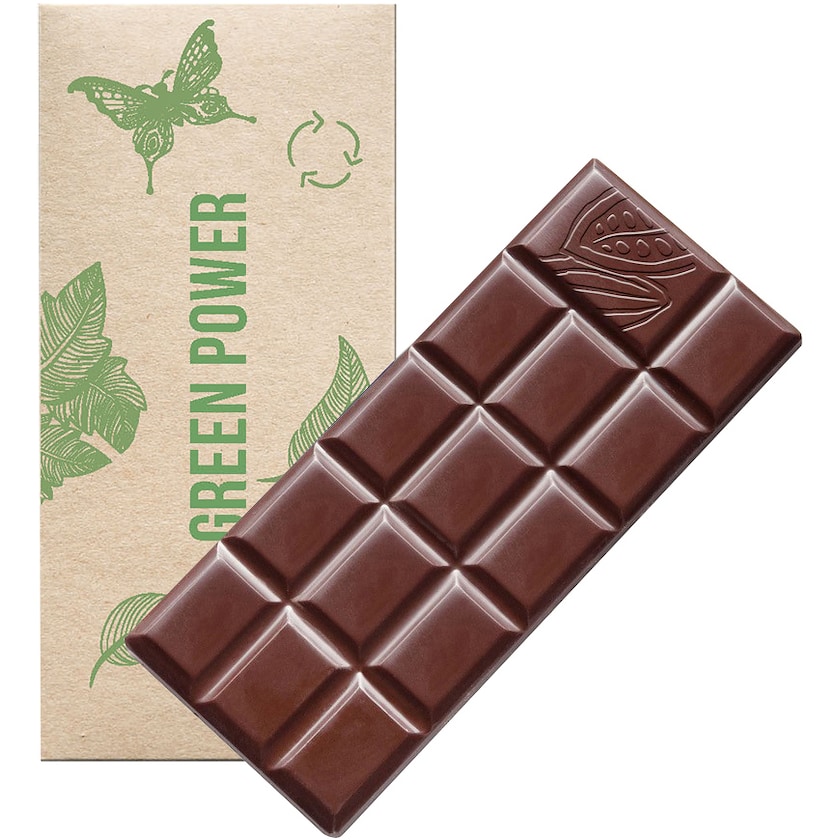 Barretta di cioccolato da 50 gr di altissima qualità all'interno di una confezione in carta riciclata. Il pacchetto è personalizzato con stampa digitale in CMYK. Questo cioccolato di altissima qualità è confezionato sottovuoto per garantire la massima igiene alimentare.