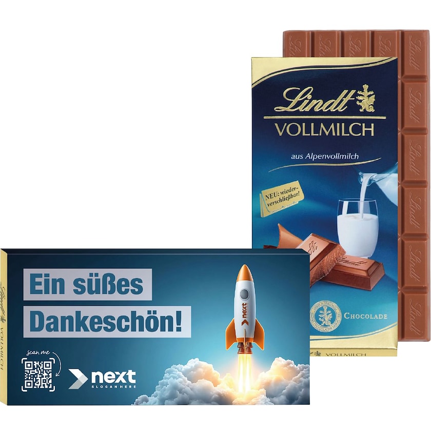 Lussuosa tavoletta di cioccolato Lind con cioccolato al latte. Intorno alla tavoletta viene posizionata una fascia di carta personalizzata.