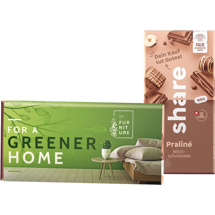 Tavoletta di cioccolata a zero emissioni certificata Fairtrade di marca Share. Il cioccolato è di altissima qualità e non contiene olio di palma. Per ogni tavoletta vendita Share dona un pasto a una persona in difficoltà. La stampa viene realizzata su una fascia di carta certificata FSC.