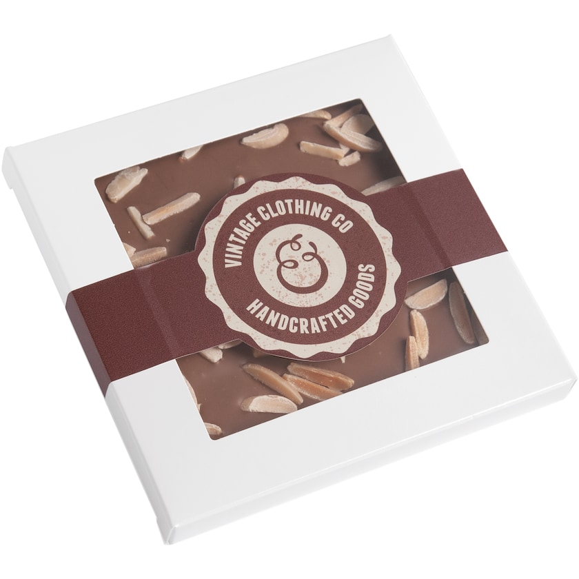Pregiata tavoletta di cioccolata di finissima qualità. Valence è impacchettata in un'elegante scatola di cartoncino dotata di finestra. Intorno alla confezione corre una fascia stampata digitalmente secondo i tuoi desideri. Scegli tra tanti lussuosi gusti.