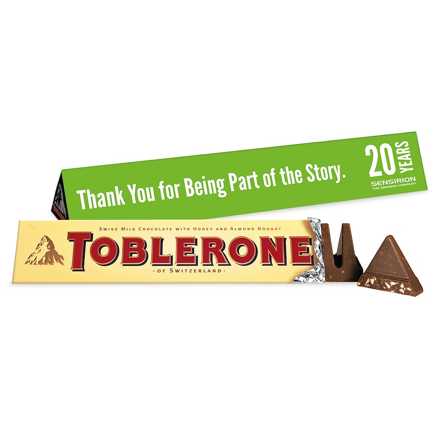 100 grammi di cioccolato prodotto in Svizzera Toblerone. Scegli tra tre diversi gusti. Il cioccolato viene inserito in una banner di cartone con la tua stampa.
