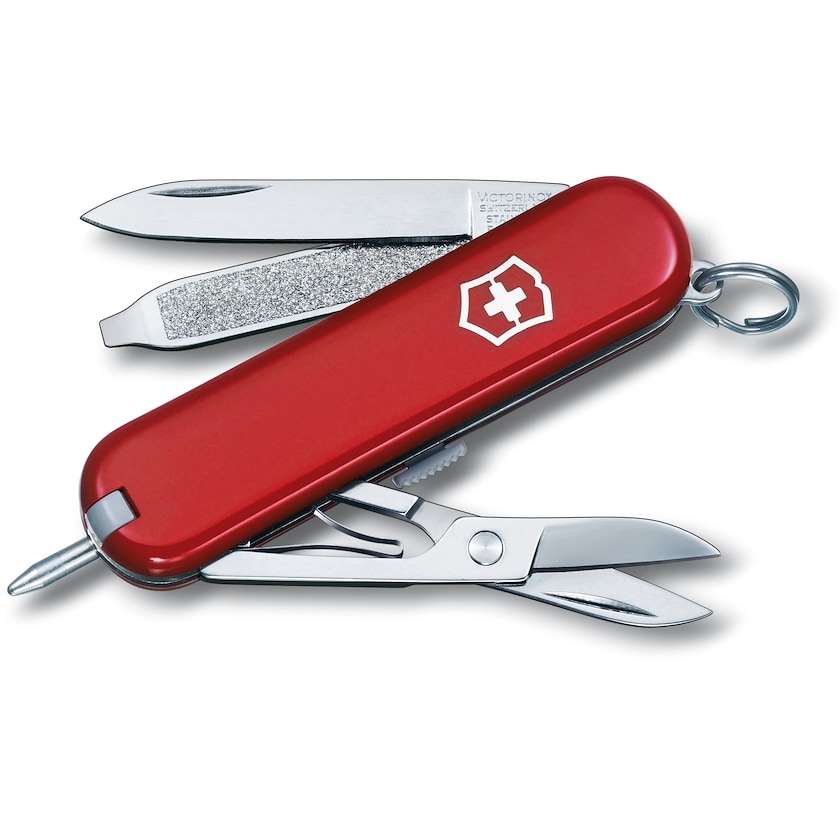 Pratico coltellino con penna a sfera. Victorinox Signature ha le stesse funzioni del modello Classic ma al posto della lima per le unghie troviamo una penna a sfera. Con coltello piccolo, forbici, penna, pinzette e anello portachiavi.