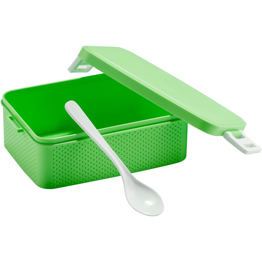 Portapranzo spazioso con cucchiaio. Il portapranzo può contenere un volume fino a circa 90 cl. Il coperchio viene chiuso con delle robuste fibbie. Il portapranzo è completamente privo di BPA.