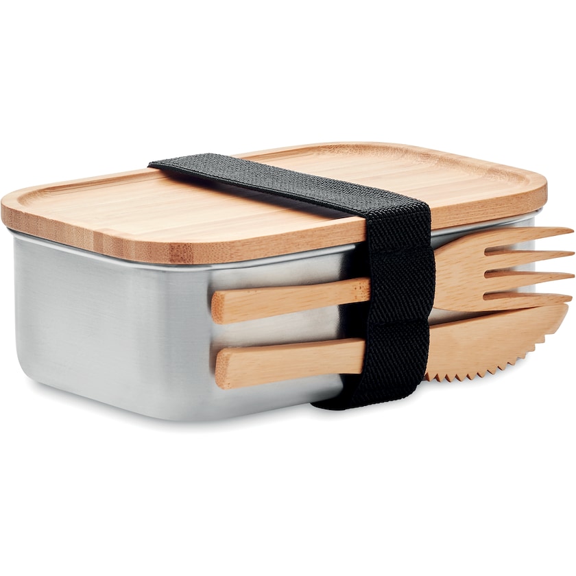 Portapranzo in acciaio inox con tappo in bambù. Coltello e forchetta inclusi. Il tappo viene tenuto chiuso da una fascia nera di poliestere.