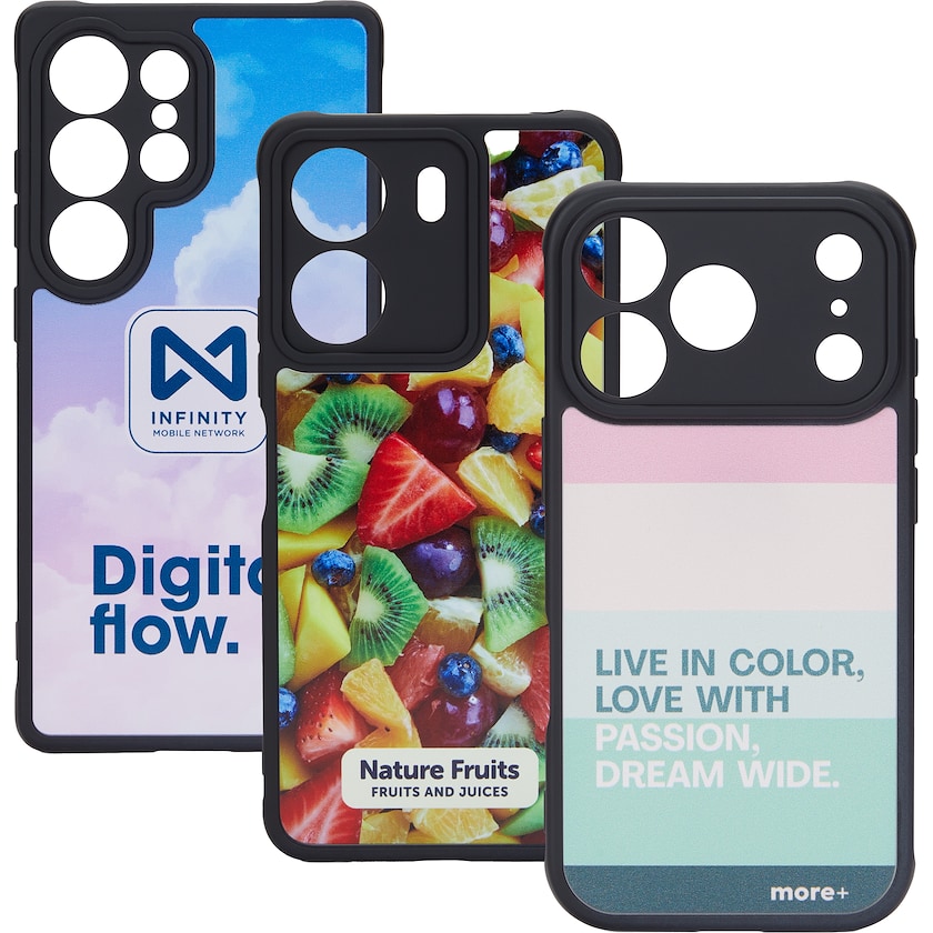 Cover per cellulari Apple, Samsung e Xiaomi. Protegge i cellulari dell'azienda e fa pubblicità al tempo stesso. Scegli tra un ampio numero di modelli diversi. L'intera parte anteriore viene stampata digitalmente secondo i tuoi desideri e puoi scegliere tu stesso tra finiture lucide o opache. Tutte le cover ordinate devono essere per lo stesso modello.