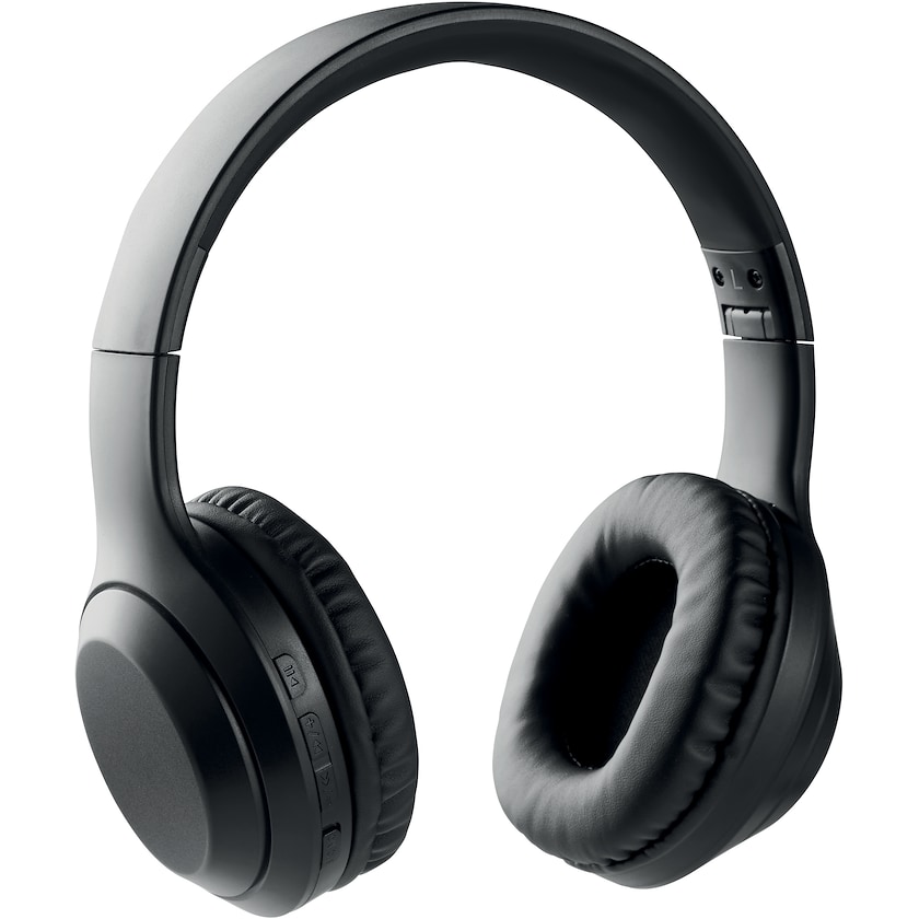 Cuffie pieghevoli senza fili. Queste cuffie sono dotate di funzione a mani libere e hanno un microfono integrato. Vengono consegnate all'interno di una custodia su cui viene realizzata la stampa.