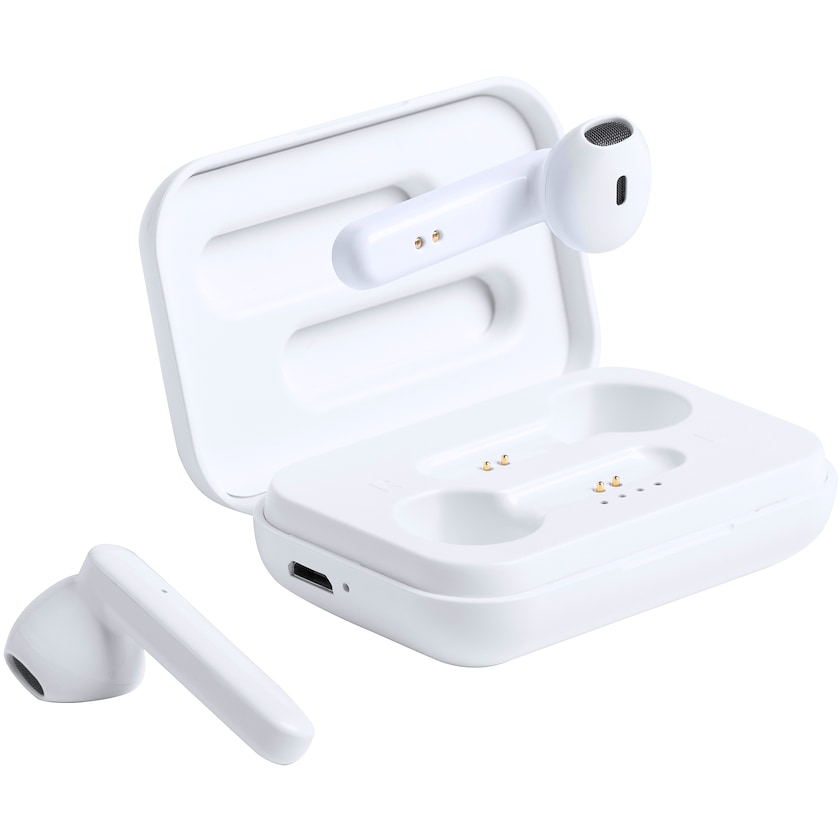 Auricolari senza fili con custodia. Gli auricolari si ricaricano all'interno della custodia. Cavo USB di alimentazione incluso.