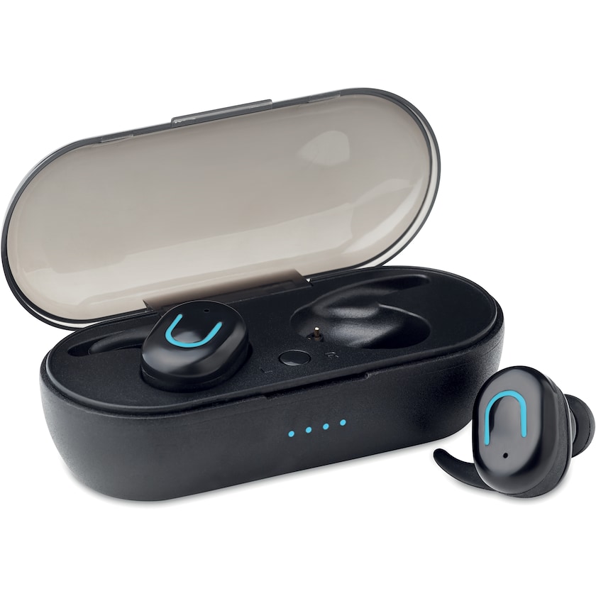 Auricolari senza fili con suono stereo. L'autonomia d'uso è di circa 3 ore con una ricarica. Cavo micro-USB incluso. Viene consegnato all'interno di una custodia che funge anche da stazione di ricarica.