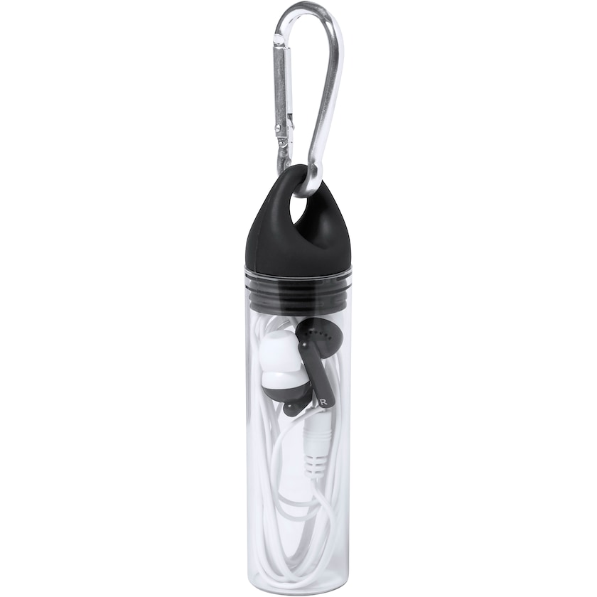 Auricolari In-Ear in custodia di plastica dura con moschettone. Gl'auricolari hanno un connettore audio da 3,5 mm. La personalizzazione avviene sulla custodia e può contenere al massimo 2-colori.