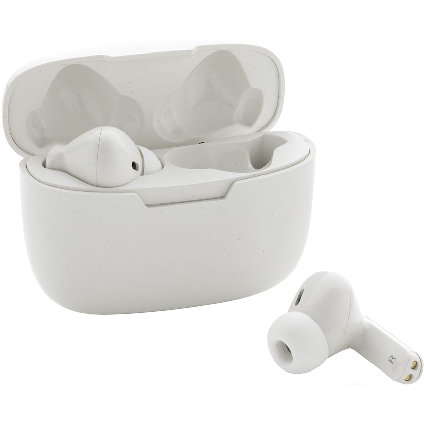 Cuffie senza fili in ABS e TPE riciclati certificati RCS. La ricarica completa delle cuffie dura 1,5 ore e avviene all'interno della loro custodia. L'autonomia d'uso è di circa 3 ore. La tecnologia BT 5.3 rende il collegamento più veloce. Le telefonate possono essere ricevute in modalità stereo. Sono inclusi tre gommini in silicone.