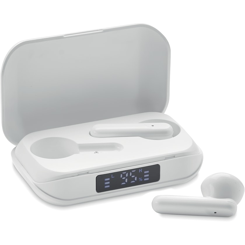 Cuffie senza fili in ABS riciclato. Le cuffie sono dotate di suono stereo, microfono incorporato e display LCD che mostra il livello di carica. Connessione automatica. Cavo per la ricarica tipo C e stazione di ricarica inclusi.