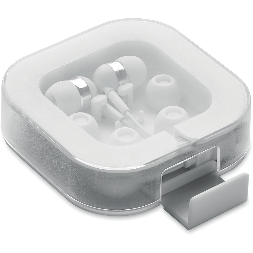 Auricolari con custodia con supporto per cellulare. Il cavo è lungo 120 cm. Sono inclusi gommini in silicone in tre dimensioni diverse.